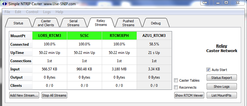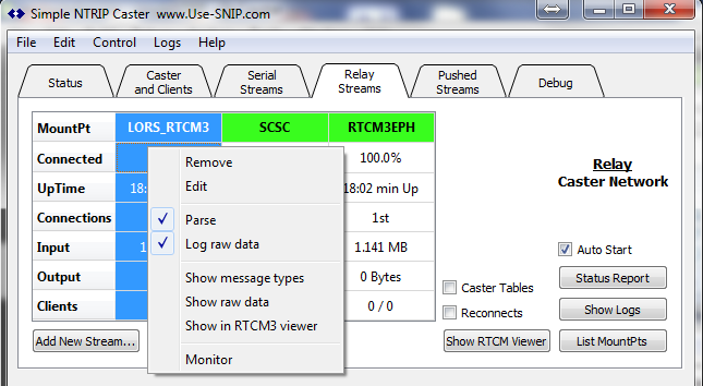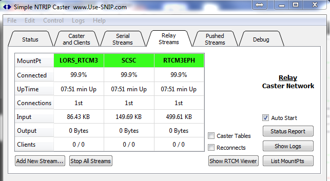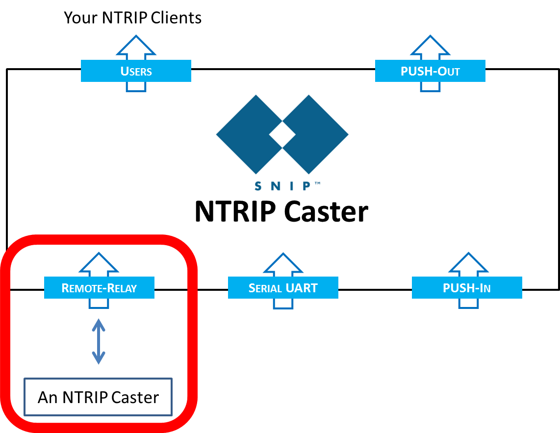 SNIP users can relay data from a remote caster by establishing a TCP/IP connection using the controls on the Relay Tab. This guide contains the necessary steps for adding a relayed caster stream in SNIP. A relay-remote stream is when your copy of SNIP acts like an NTRIP Client and connects to another (remote) NTRIP Caster and then relays that data to your users (along with your other streams of data).