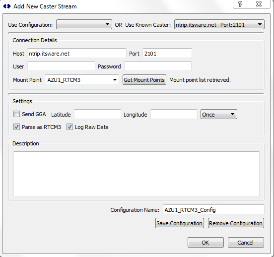 In the above example the user has selected the known caster “ntrip.itsware.net” which populated the host, port and user details, and then automatically returned the current set of mount point for that Caster. The first entry (AZU1…) was selected and a configuration name was automatically developed from this in case the user wanted to save it. The default values are to parse the RTCM3 stream and the log the data file, but these can be changed as required.