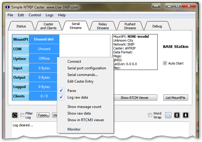 Start with an empty (unused) serial slot you will see in the image below. Right click on the slot (or the Add New Stream button) and you will see four commands which are unique to serial stream data, as well as the same common menu controls used in other streams. You can also see (in the right boxed label) that no caster table information (the mountPt and other details) has yet been set up for the serial stream slot.