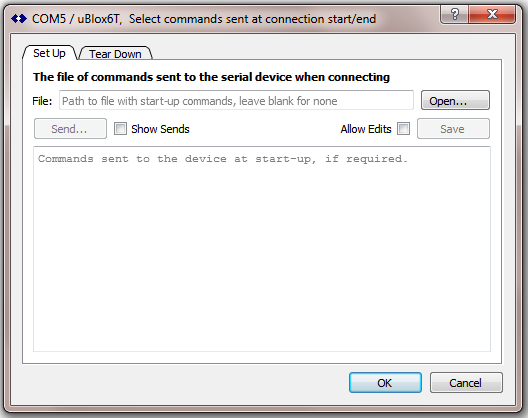Often tools provided by the vendor are the best to establish the correct setup commands On many GNSS devices these can be saved into device memory for further use between connections and/or power cycles. Other devices require this information to be provided with every power cycle, so SNIP provides a means to send sequences of such commands to the device to put it into a known state at both setup and shutdown times.