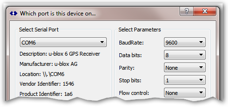 Had we elected to connect to the native USB port of the uBlox device, the description and the manufacturer text would differ, (as well as the port used) displaying the text below. This raises an important point that the driver text displayed reflects the driver, which may or may not be the name of the GNSS maker. Often it is the name of an intermediary firm which provided the driver software to the GNSS device or to the serial-USB cable / converter.
