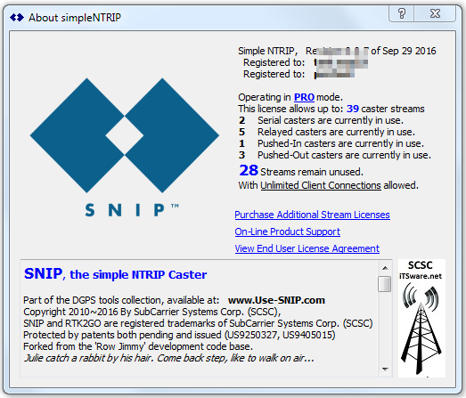 - The primary improvement in this release was moving to a more flexible licensing model that allows SNIP owners the ability to add additional connection streams. Prior to this release a registered SNIP owner had to upgrade from “Basic” to “Pro” in order to add even a single additional stream. And the allocation of the stream types (remote-relay, serial, PUSH-In, and PUSH-out) was pre-allocated and fixed. In our Beta tests this proved to be an issue with users who wanted more flexibility for their own unique needs. In the new model all types of streams are treated equally and the user can apply any unused stream in their license to create any stream types they wish. Here is an example showing the revised About Box for a Pro user who has also added nine additional streams (and is shown using eleven of the allowed 39 streams at this time, leaving 28 unused).