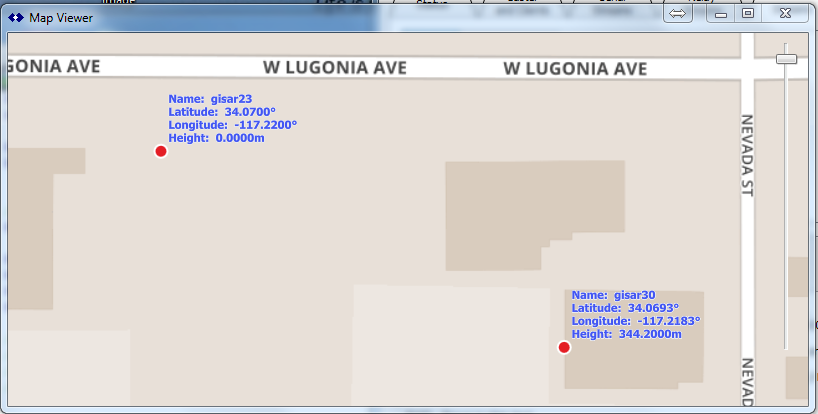 The site called “gisar23” is sending messages in the RTCXM2.3 format (which SNIP does not decode at this time), while the site “gisar30” is sending messages in the RTCM3 formats (with SNIP has decoded and has extracted the more precise location). These come from the same antenna and therefore the exact same location, one is plotted using the rough caster table data, the other the precise ECEF data of the message stream. You can see from the base map that “gisar30” is located alongside the edge of a building wall. This is a site local to our offices (~50km) and is run by the GIS firm ESRI. [We often use it for longer range baseline L1-only testing.] In this image the rounding caused by the less precise data in the caster table is clear to see.