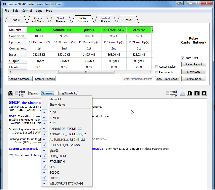 Note: In order to use filtering by the stream name, the correct type of filter must NOT be filtered (the checkbox must be off). For example, to filter the console only to display a serial type caster with the mountPt “myUblox,” all other caster names should be disabled (use the “Show None” menu item, select the “myUblox” menu), and the check box for “Serial Caster Details” should remain checked – to indicate that such a type will be shown. Set the Log Threshold for the level of detail desired. This ensures that the log events for the desired stream are not filtered.