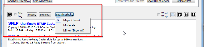 - The Major setting, (as a rule), presents only application level events such as the general state of the caster system and more critical error events. In this setting, errors occurring with individual caster data streams, or with individual end users, are generally suppressed and not shown. The thinking here is that from a server perspective, data source and user level connection errors are all routine normal events that resolve themselves. [It might be aggravating to the client trying to connect, but there is nothing wrong with the server itself.]