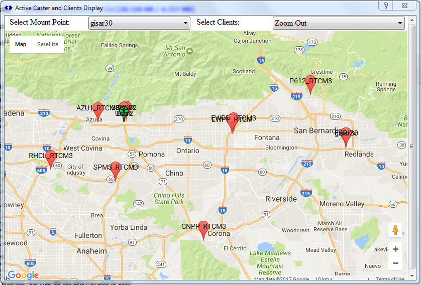 For this article we have used the remote-relay mode to connect a SNIP node to four different networks (our own, a private party, and two government run networks) to create a local regional network of casters in the greater San Gabriel valley area. It is located near our primary offices with eight well spaced base stations all providing RTCM3 L1/L2 data. The San Gabriel valley is part of the Los Angles basin in California, USA. The resulting network is shown in the map display image created by SNIP bellow: