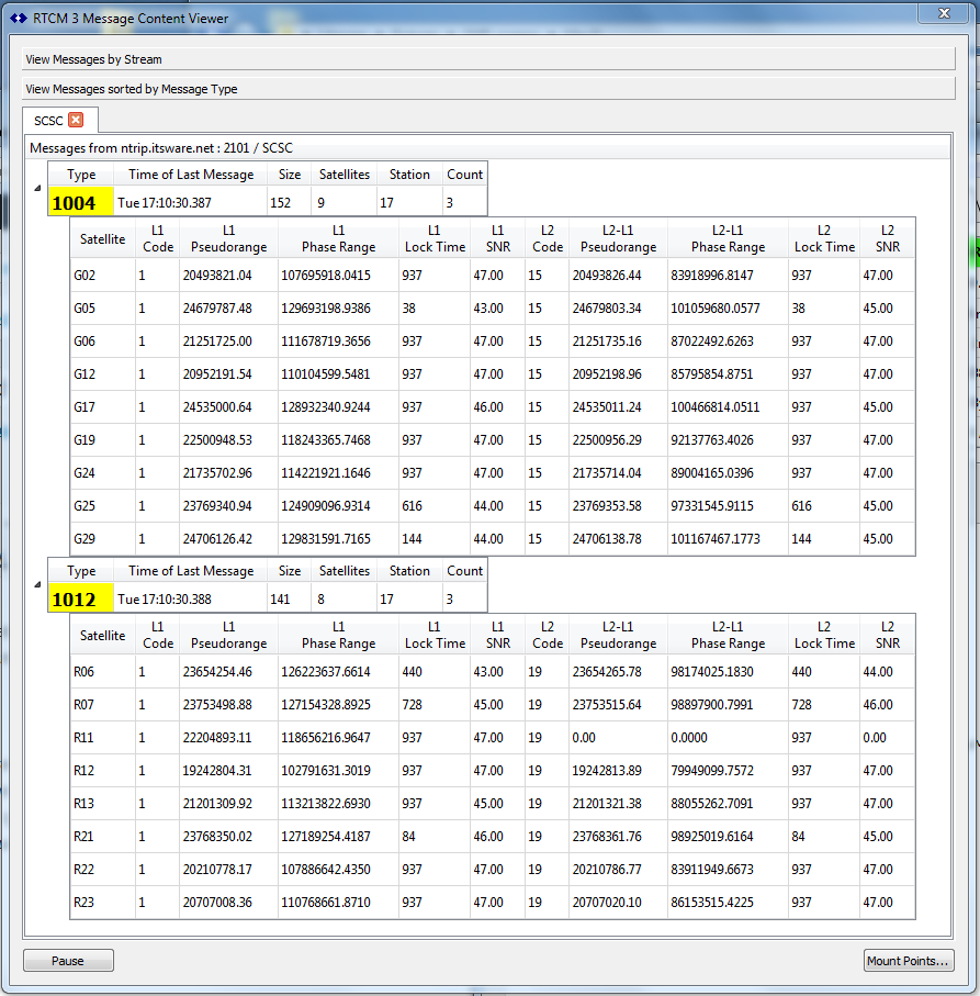 The RTCM3 Decoder Dialog, showing typical content from the GPS 1004 and GLO 1012 messages