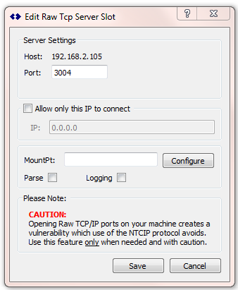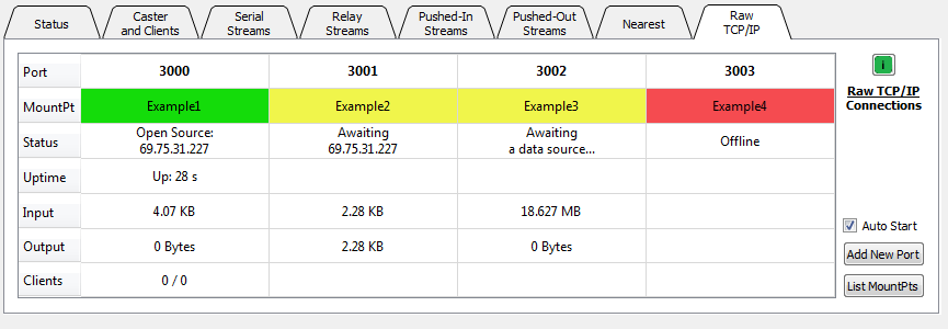 Note: The remote sending device would then send its raw data to this port [in the first image the IP:Port would be: 192.168.2.105:3004] This IP value can be registered with DNS if desired and can use port forwarding from your firewall. When the connection occurs, the mountPt names will be used (as well as the Caster Table entry details) in the local Caster table.