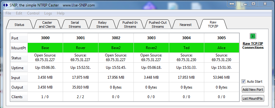 Hint: The above image shows six active RAW TCP/IP mountPt streams on a SNIP node that has been running for about 15 hours. The ports 3000~3005 have been used for these connections (unlike the NTCIP protocol, only one connection per port is allow with using RAW data). In the image above, three of the streams allow connection only from specific IPs (69.75.31.227 and 69.75.31.23), while the others (ones with the text “Open”) will accept data from any IP address.