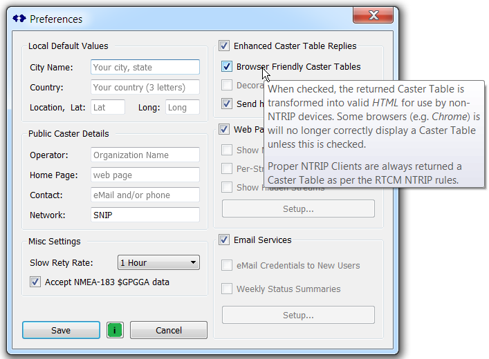 The misc. settings group is used to control the rate at which “dead” remote-relay data streams are retried. And it is also used to control certain flags in the resulting Caster Table that control how or if NTRIP Clients will send their estimated locations back to the SNIP Caster.
