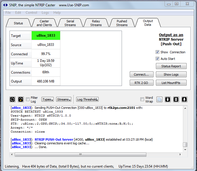 You can also see in the console log that this SNIP Caster has created a PUSH-out connection to our RTK2go.com portal and is sending the local data there. You can connect SNIP‘s PUSH-out data to any other caster that will accept it.