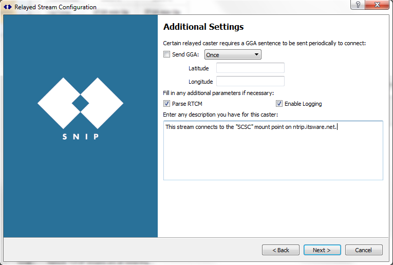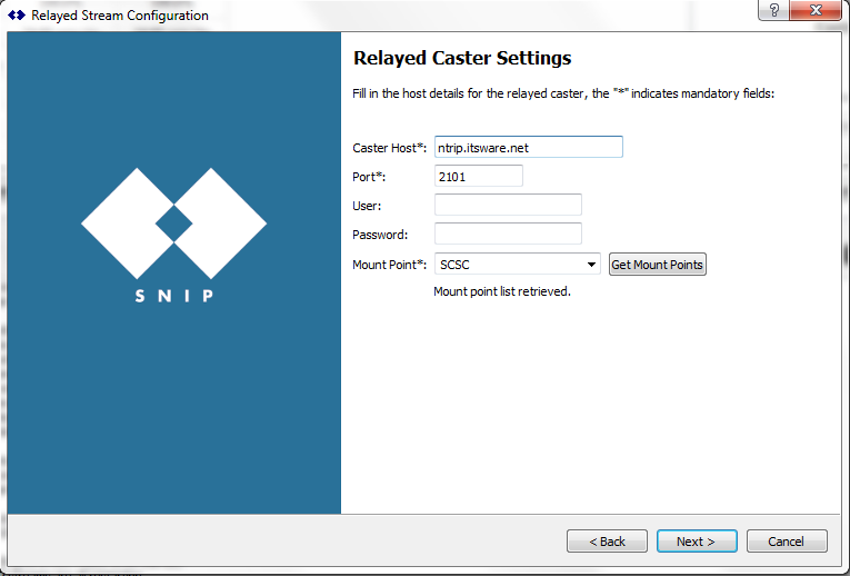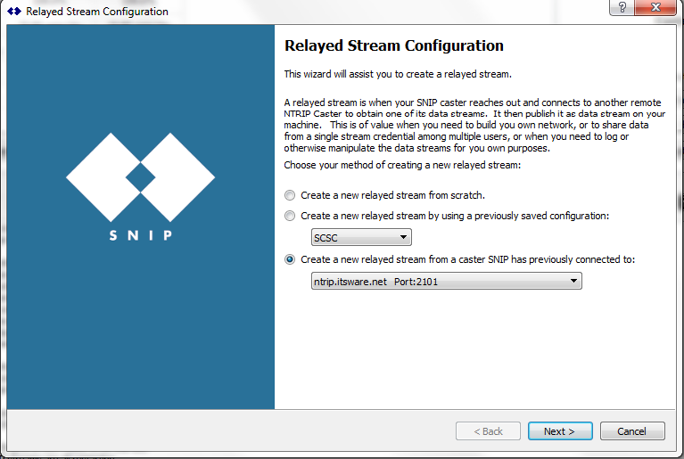 The Relayed stream configuration wizard provides a simple step-by-step method to add a new relay data stream to your SNIP Caster. This guide will gives an overview on each step of the stream configuration process in the wizard.