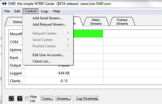 The serial stream configuration wizard can be located under  the menu item  “Control->Add Serial Stream…”
